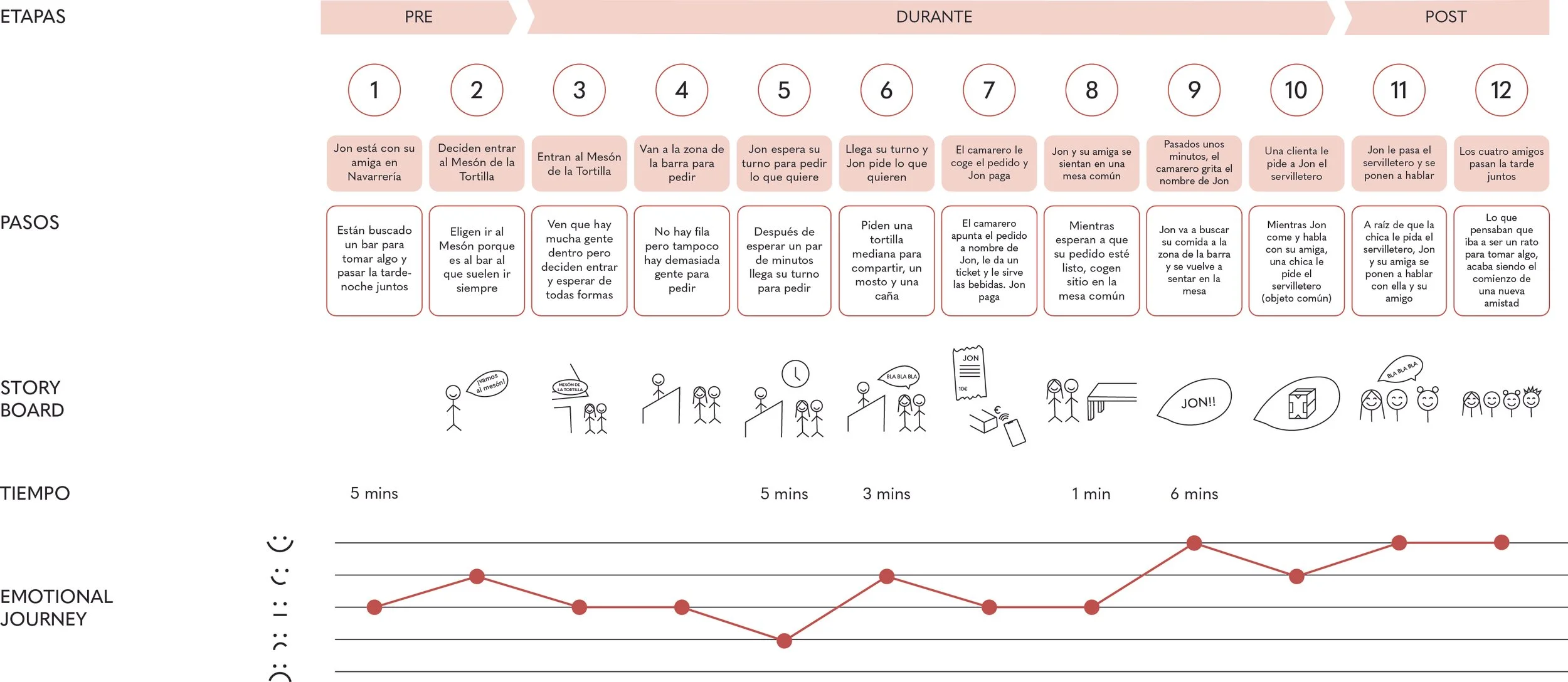 Para identificar los desencadenantes de la incoherencia entre el nombre del bar y la experiencia al entrar, utilizamos herramientas como entrevistas, cuestionarios, mapas de flujo, y focus groups con usuarios clave. Descubrimos que, además, algunos de los puntos de dolor durante la experiencia de los clientes en el bar es la espera, el no encontrar un lugar para sentarse o la comida fría y de una calidad inferior a la esperada. Sintetizamos los hallazgos mediante blue prints, customer journey maps, personas y system maps, lo que nos permitió detectar puntos críticos y proponer mejoras alineadas con la identidad del bar.
